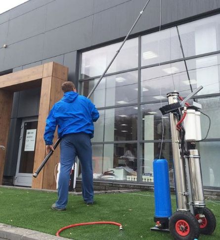 Появлению новой технологии мойки фасадов зданий мы обязаны Ирву Такеру жившему в США в 50-х годах. Он внедрил в обычный процесс мойки окон телескопическую алюминиевую штангу со щеткой, облегчив себе работу на высоте. В последствии он начал совершенствовать технологию применяя специально подготовленную очищенную воду. Он понял что деминерализованная вода наиболее эффективно борется с загрязнениями, что главным образом влияет на конечный результат.